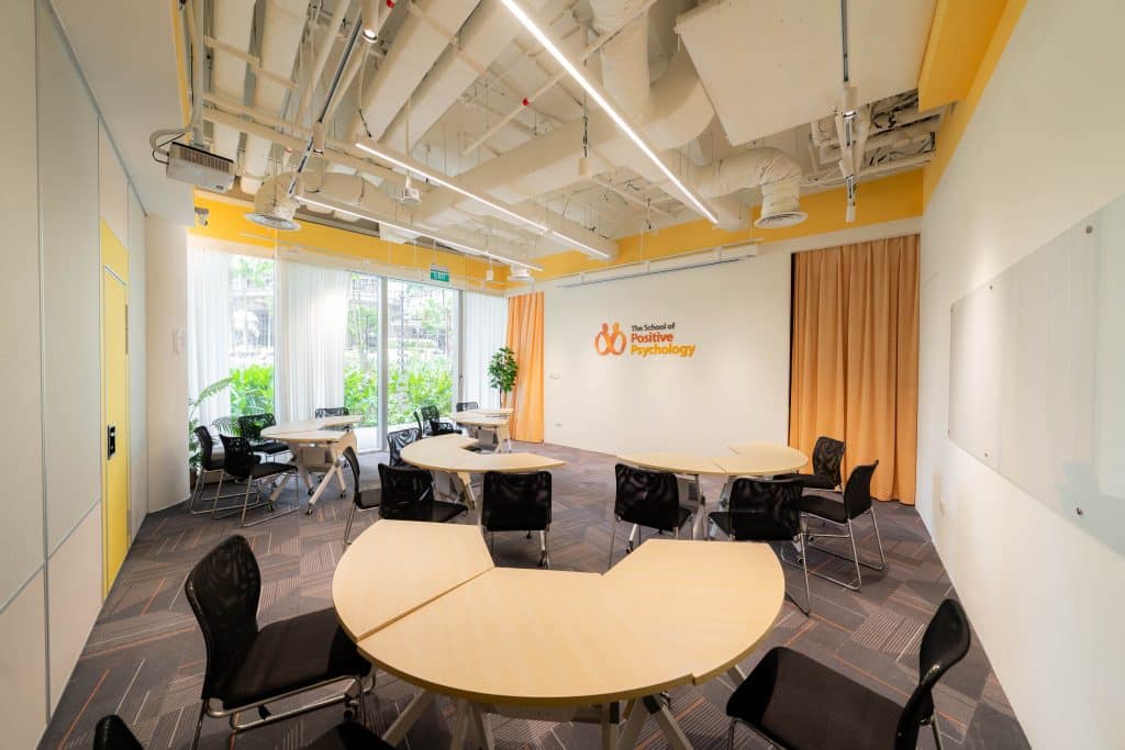The School of Positive Psychology is uniquely designed as a professional and adult learning space, classrooms for lectures, seminars and focus group discussions. Seating arrangements are subjected to circular seating (group work, peer discussion or psychotherapy session) or seminar style seating (lectures, workshops, presentations).